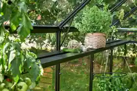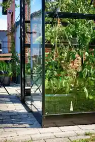 Eine Besonderheit des geräumigen Hall Qube-Gewächshauses ist das revolutionäre Türdesign mit Gleitschiene. Es ist eine stabile Schiebetür, die sich leicht öffnen und schließen lässt. Die Schiene ist so konstruiert, dass sich die Tür auch ohne Räder nicht festklemmt oder aus der Schiene fällt. Die schräge Dachkonstruktion sorgt dafür, dass Schneeverwehungen schnell herunterrutschen, und somit wird das Dach nicht unnötig belastet.