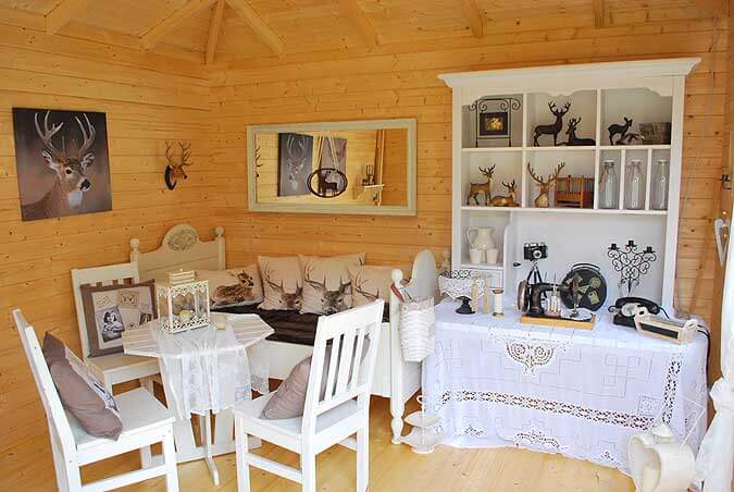 Fast wie ein Ausstellungsraum wirkt der bis ins kleinste stilistisch konsequent durchkomponierte Innenraum des fünfeckigen Gartenhauses Ancona-40. Familie Matuscheck hat mit diesem Haus den ersten Preis beim 1. Gartenhaus-Fotowettbewerb 2014 gewonnen – wohl verdient, wie man sieht! Die Idee „Jagdzimmer“ wurde hier auf originelle, auch ein wenig ironische Art umgesetzt: