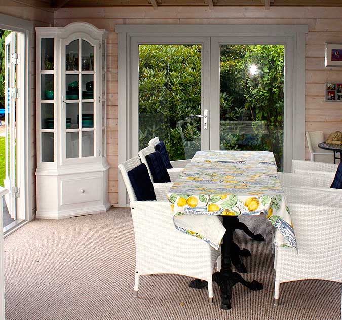 Das Gartenhaus Modell Oslo-44 ist mit seinen gut 16 Quadratmetern sehr geräumig. Acht Personen finden am langen Esstisch Platz, doch bleibt daneben noch viel Platz für eine kleine Hausbar und allerlei schöne und nützliche Dinge: