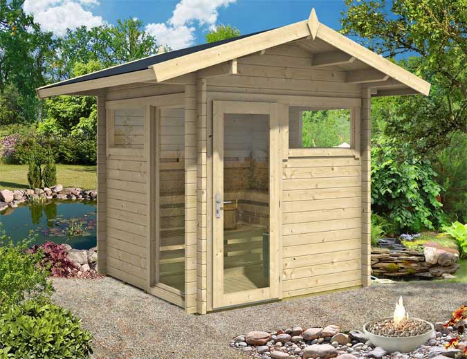 Gartensauna: In klassischer Bauform wählst du die Mini-Sauna für den Garten als platzsparende Variante ohne Vorraum. Wenn es flächentechnisch doch etwas grossformatiger und komfortabler sein kann, bieten Ausführungen mit Vorraum (als Umkleidemöglichkeit oder Stauraum für Saunazubehör) oder als kleines Saunahaus Extra-Komfort.