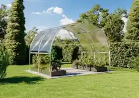 Das Gewächshaus Estragon passt perfekt in jeden Garten. Das klassische Design verbindet eine robuste Bauweise mit höchster Flexibilität. Das Gewächshaus misst 3 x 6m und lässt sich beliebig mit der Erweiterung von 3 x 2m vergrößern. Die zweigeteilte Tür und das auf der Gegenseite befindliche Fenster machen die Anpflanzung von Pflanzen und Gemüse zum Kinderspiel. Als optionales Zubehör gibt es darüber hinaus ein Dachfenster (wahlweise mit Automatik), das für eine perfekte Luftzirkulation sorgt.